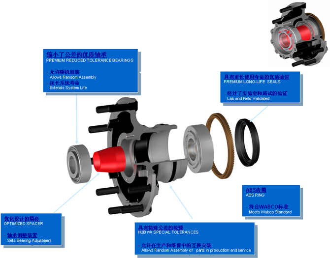 1.輪轂總成由精加工輪轂、優質油封、特殊公差要求的滾子軸承和獨特的的精加工軸承隔套等零件組成